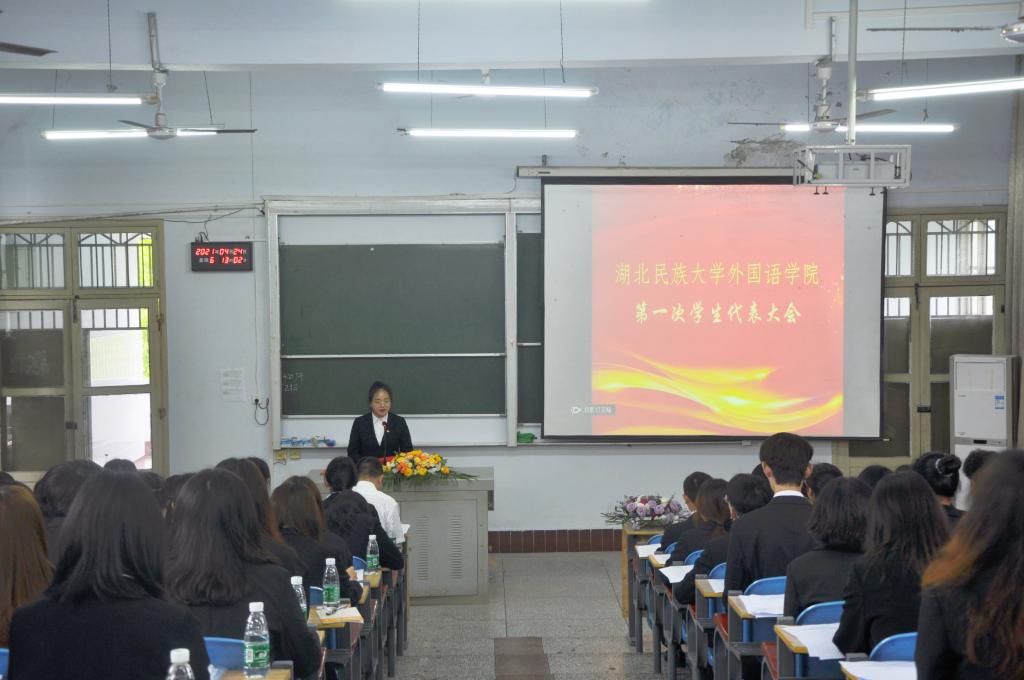 党总支书记周代明讲话。他首先对本次大会的召开表示热烈祝贺,随后通过干部素养、组织效能、服务成效、文化育人等四个方面给予了学生会工作以高度赞扬,对全院的青年学生提出三点期望:一是注重思想引领,明确组织职能;二是注重实干精神,打造坚韧意志;三是勇担时代使命,发挥先锋作用。而后,我院学生会主席余红霞作以《外彰风采语道韶华——团结带领外院青年励志笃行献礼青春》为主题的工作报告。