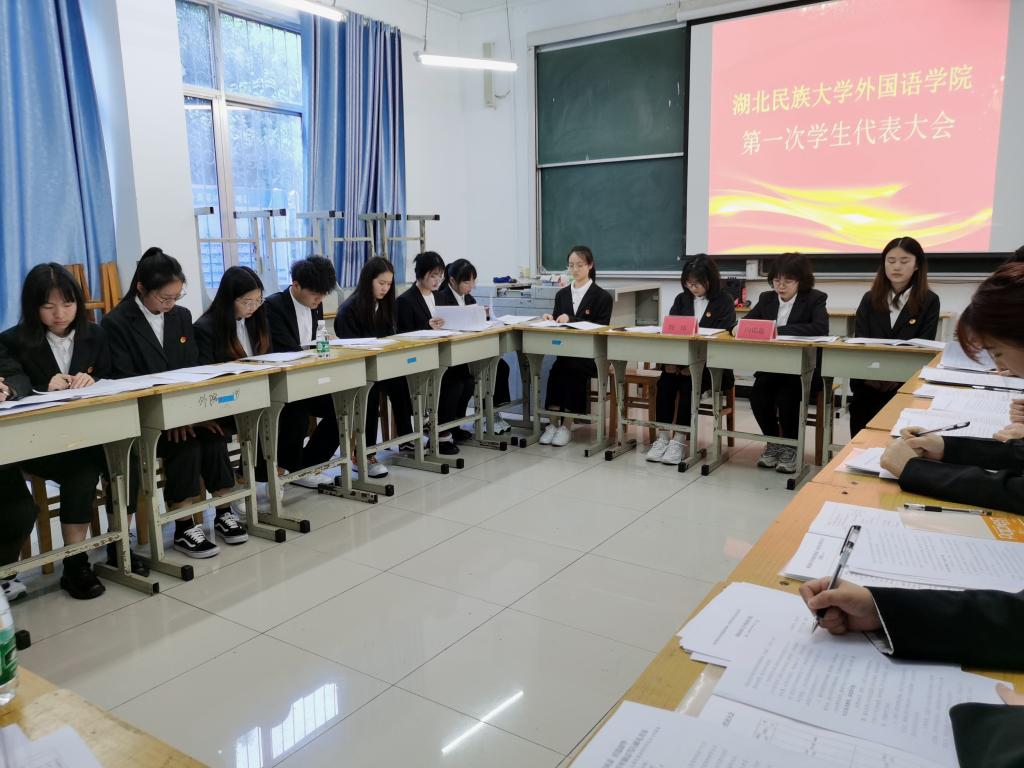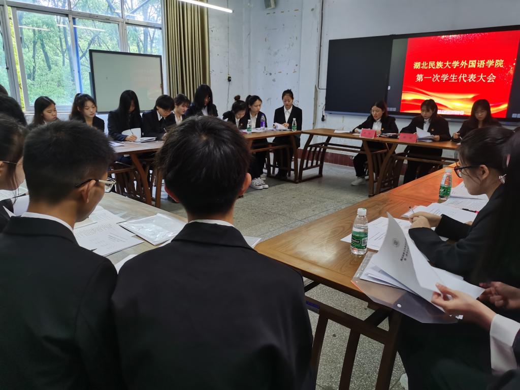 各代表团前往各分会场进行会议。随后,各代表团团长向主席团报告讨论结果,主席团进行第二次会议,审议通过并提交于大会。在大会第二次全体会议中,主席团候选人进行竞职演讲。最终,文涵、胡依依和黄梦真入选为外国语学院学生会第一届主席团成员,马丽等13名学生代表参加我校学生代表大会。