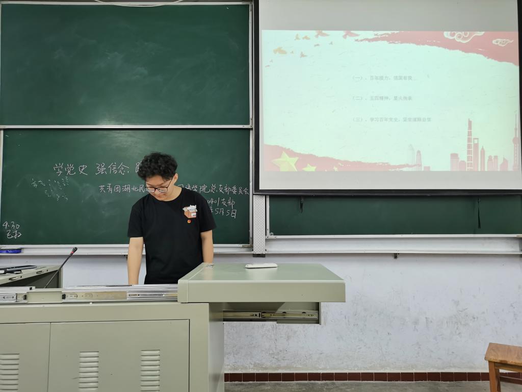活动第一项,全体成员起立奏唱团歌。随后,主讲人引用习近平于清华大学的讲话告诫青年应“立大志,明大德,成大才,担大任”。并借一名中国科学院大学在读研究生发表辱华言论提出大学生应通过:树立正确三观;加强精神文明;结合理论知识加强社会实践;与时俱进,培养自己的时代意识四个方面提高自我道德修养。紧接着,主讲人向在场青年讲述五四青年节的由来,历史及意义。并运用一个视频展示我国建党至今我国发生的变化,加深在场青年的印象。最后,主讲人通过简述《探索中国自己的建设社会主义的道路》的内容带领在场青年学习百年党史,坚定道路自信。
