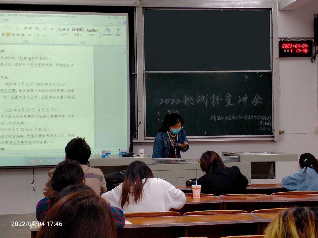2022年4月4日17:40我院团总支素质拓展部在6B204召开2022年“挑战杯”宣讲会,号召各支部有意愿参加挑战杯的支部成员以及素拓委员来参加此次挑战杯竞赛,并鼓励素拓委员在各支部内大力宣传此次“挑战杯”竞赛。通过这次宣讲,让我院学生充分了解到挑战杯是什么,激发了我院学生的参与热情。同时我院也进行了其它一系列的宣传,来动员我院学生积极报名参加此次竞赛。