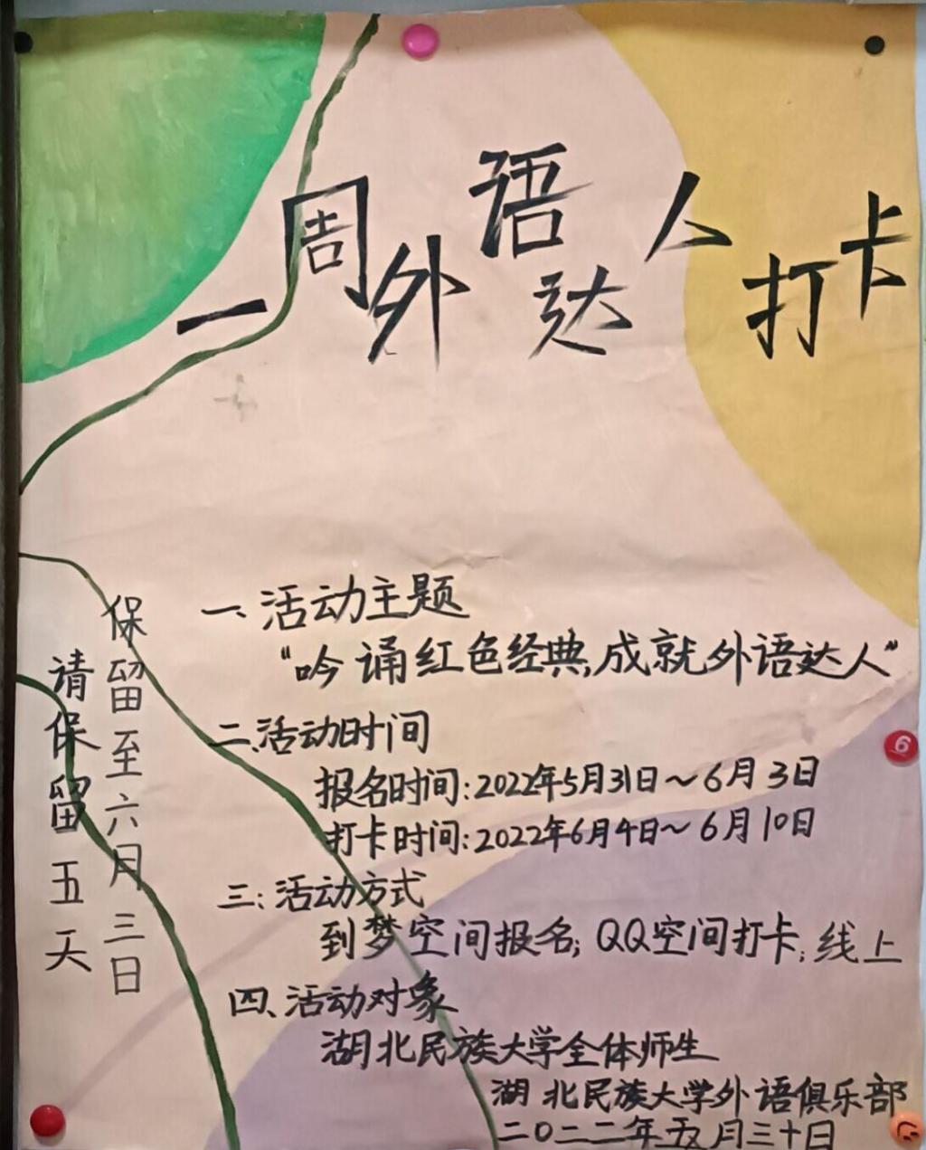 本网讯(记者 李春艳 闵润柳)为丰富大学生的课外生活,学习先进红色文化,提高大学生的外语水平。365电子娱乐官方网站外语俱乐部于 2022年6月4日至6月10日线上举办以“吟诵红色经典,成就外语达人”为主题的外语达人打卡活动。此次活动面向365电子娱乐官方网站全体学生。