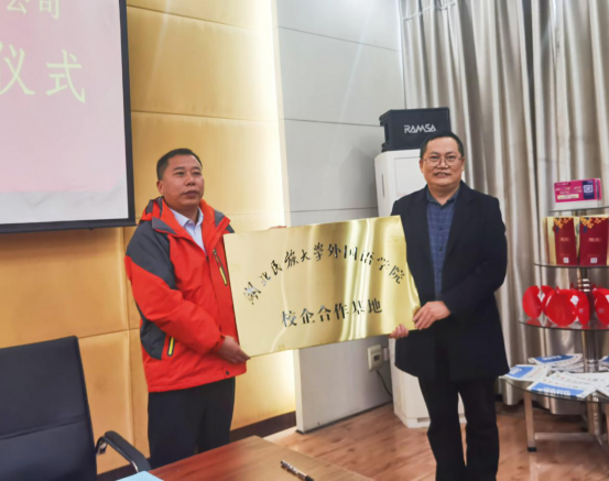 外国语学院院长骆贤凤与湖北金果茶业股份有限公司签订了校企合作协议,并举行授牌仪式