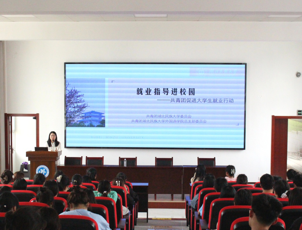 团团微就业,高校在行动。为进一步帮助我校学生树立就业观念,拓展就业视野,校团委、外国语学院团总支于5月4日在文汇楼6402报告厅举行了“就业指导进校园——共青团促进大学生就业行动”讲座活动。本次活动特邀马家希望小学副校长、湖北青年五四奖章获得者、外国语学院优秀校友陈若竹作指导,100余名学生参加。