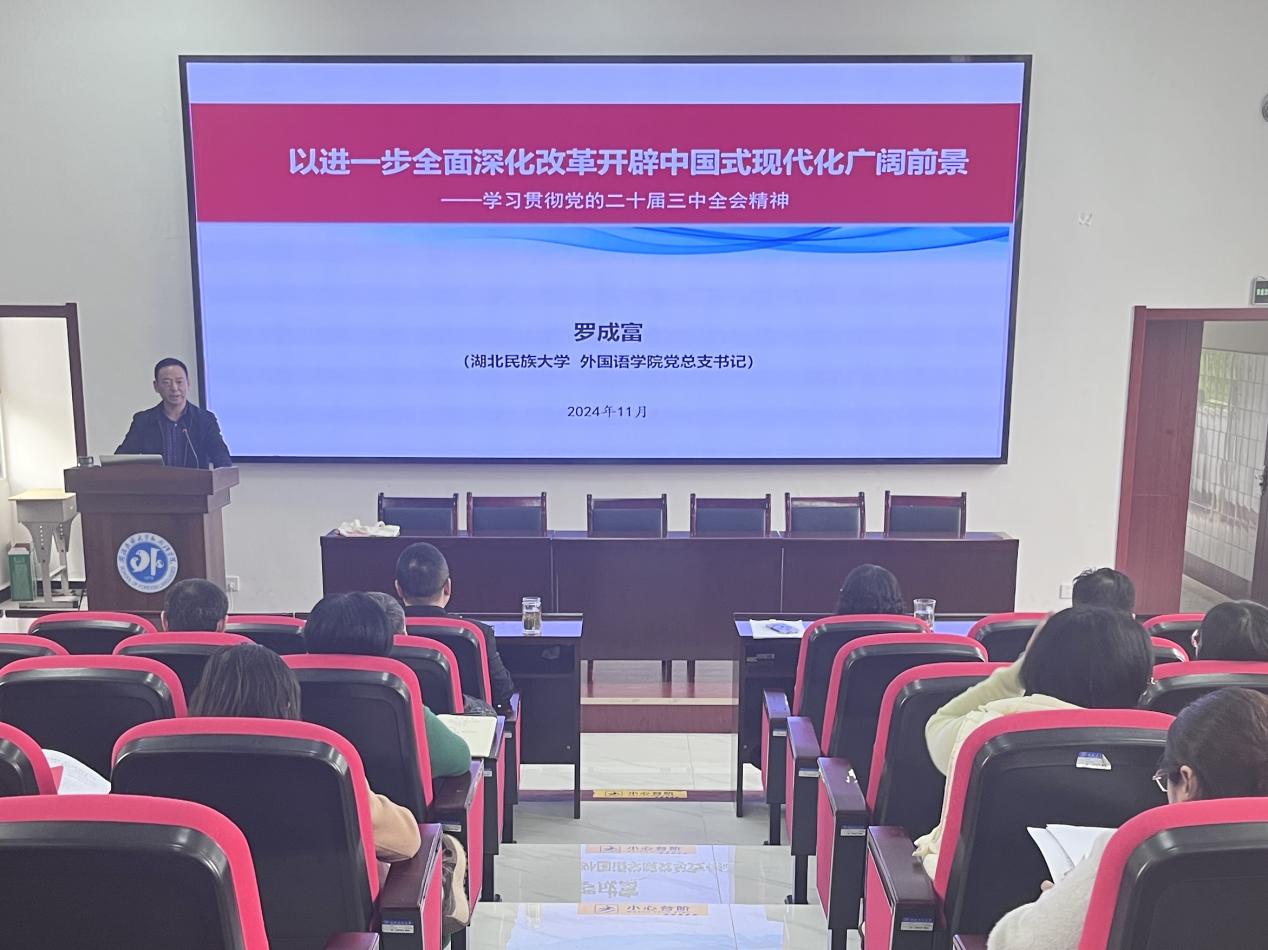 时间:2024-11-15 编辑:办公室 点击:为深入学习贯彻党的二十届三中全会精神,深刻领会习近平总书记关于全面深化改革的一系列新思想、新观点、新论断,切实把思想和行动统一到全会的决策部署上来,2024年11月14日,外国语学院在6402学术报告厅开展了学习贯彻党的二十届三中全会精神专题学习。学习活动由院长骆贤凤主持,党总支书记罗成富担任主讲,全体教师及部分学生代表参加。