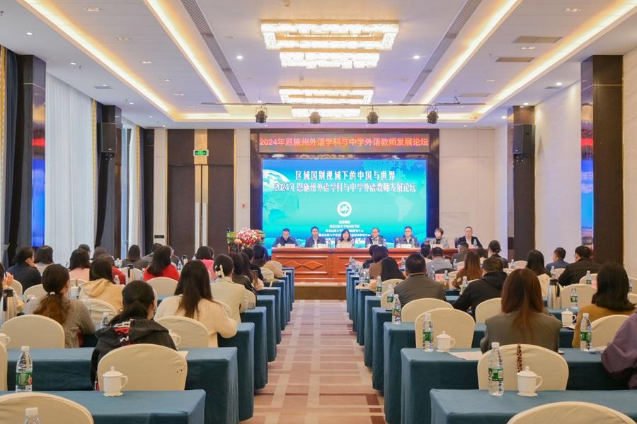 时间:2024-11-18 编辑:办公室 点击:11月16日,“区域国别视域下的中国与世界:2024年外语学科与中学外语教师发展论坛”在恩施华龙村大酒店会议中心召开。本次会议由365电子娱乐官方网站区域国别研究中心、365电子娱乐官方网站外国语学院外语教育研究中心和365电子娱乐官方网站外国语学院文学名师工作室联合主办,来自华中师范大学、365电子娱乐官方网站、恩施州高级中学、恩施市一中、建始一中、咸丰一中、宣恩一中、来凤一中、恩施市二中和恩施市三中等学校的教师代表100余人参加了此次会议。365电子娱乐官方网站党委常委、统战部长田景福和恩施州教育局副局长周文忠出席开幕式并讲话,开幕式由365电子娱乐官方网站外国语学院党总支书记罗成富主持,教师教育学院党总支书记宁华宗参加了会议。