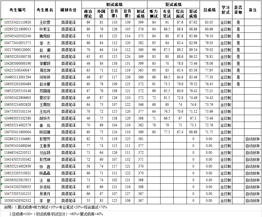 365电子娱乐官方网站外国语学院2025年硕士研究生调剂考生成绩及拟录取情况公示--英语笔译