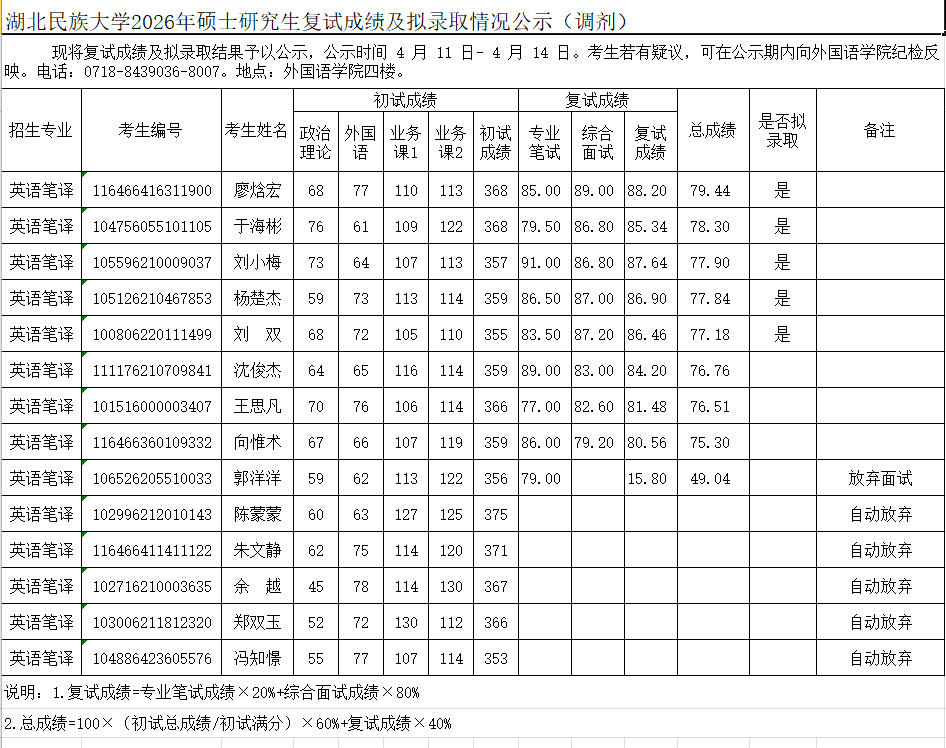 365电子娱乐官方网站2026年硕士研究生复试成绩及拟录取情况公示(调剂)