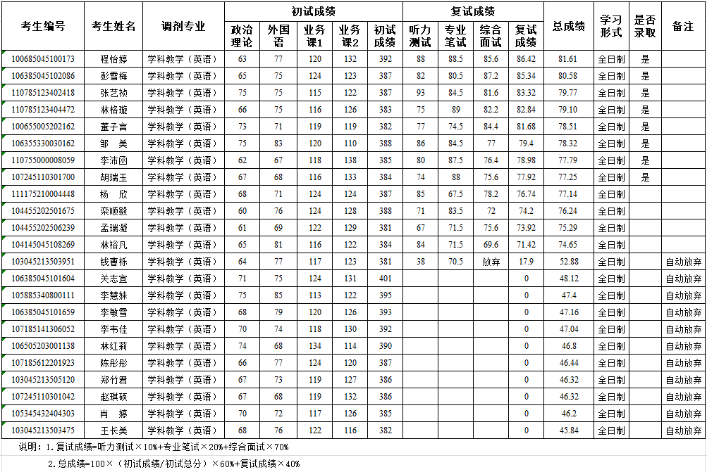 365电子娱乐官方网站外国语学院2025年硕士研究生调剂考生成绩及拟录取情况公示--学科教学(英语)