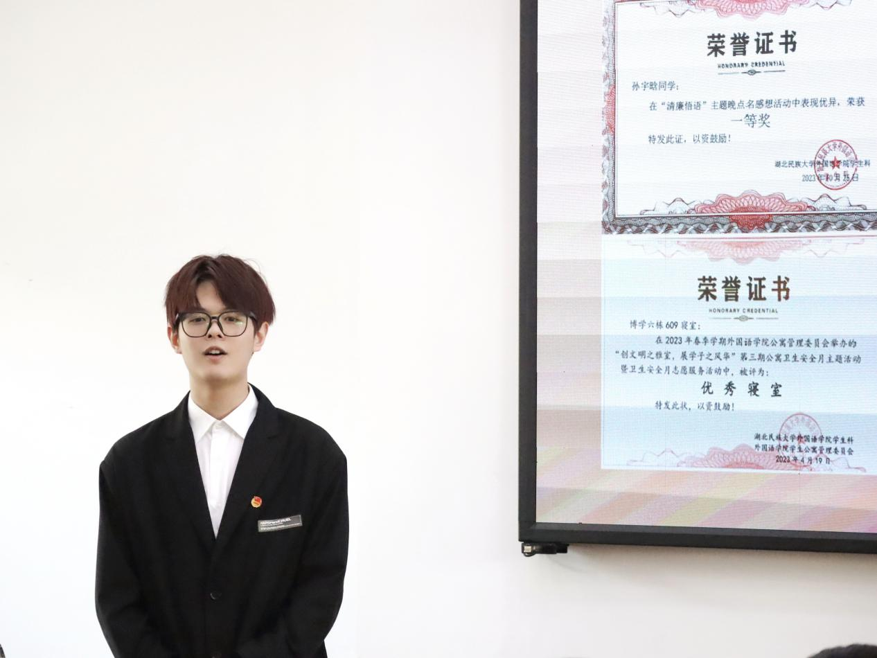 时间:2024-05-29 编辑:办公室 点击:简介:孙宇晗,男,湖北安陆人,365电子娱乐官方网站外国语学院2021级英语专业学生,中共预备党员。2021-2022年度“优秀共青团干部”、2022-2023年度“四星级志愿者”、外国语学院“最美志愿者”、2023-2024年度“十佳共青团员”。