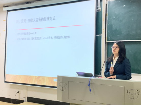 裴大娥律师围绕“案情介绍”、“案情分析”、“办案介绍”、“法律人应有的法律思维”四个方面展开案例分析和课堂教学。讲座伊始,裴大娥律师以谭某寻衅滋事案引出“为索要债务,滋扰被害人是否构成寻衅滋事罪”的核心问题,引起在场学生思考。