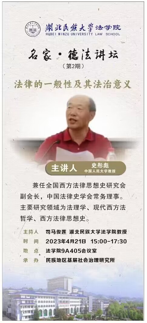 本网讯(记者 姚璐/文 黄卓然/图)4月21日,“法律的一般性及其法治意义”学术讲座在法学院9A405会议室成功举办,由中国人民大学史彤彪教授主讲,我院司马俊莲教授担任主持人,部分教师与学生参与本次讲座。