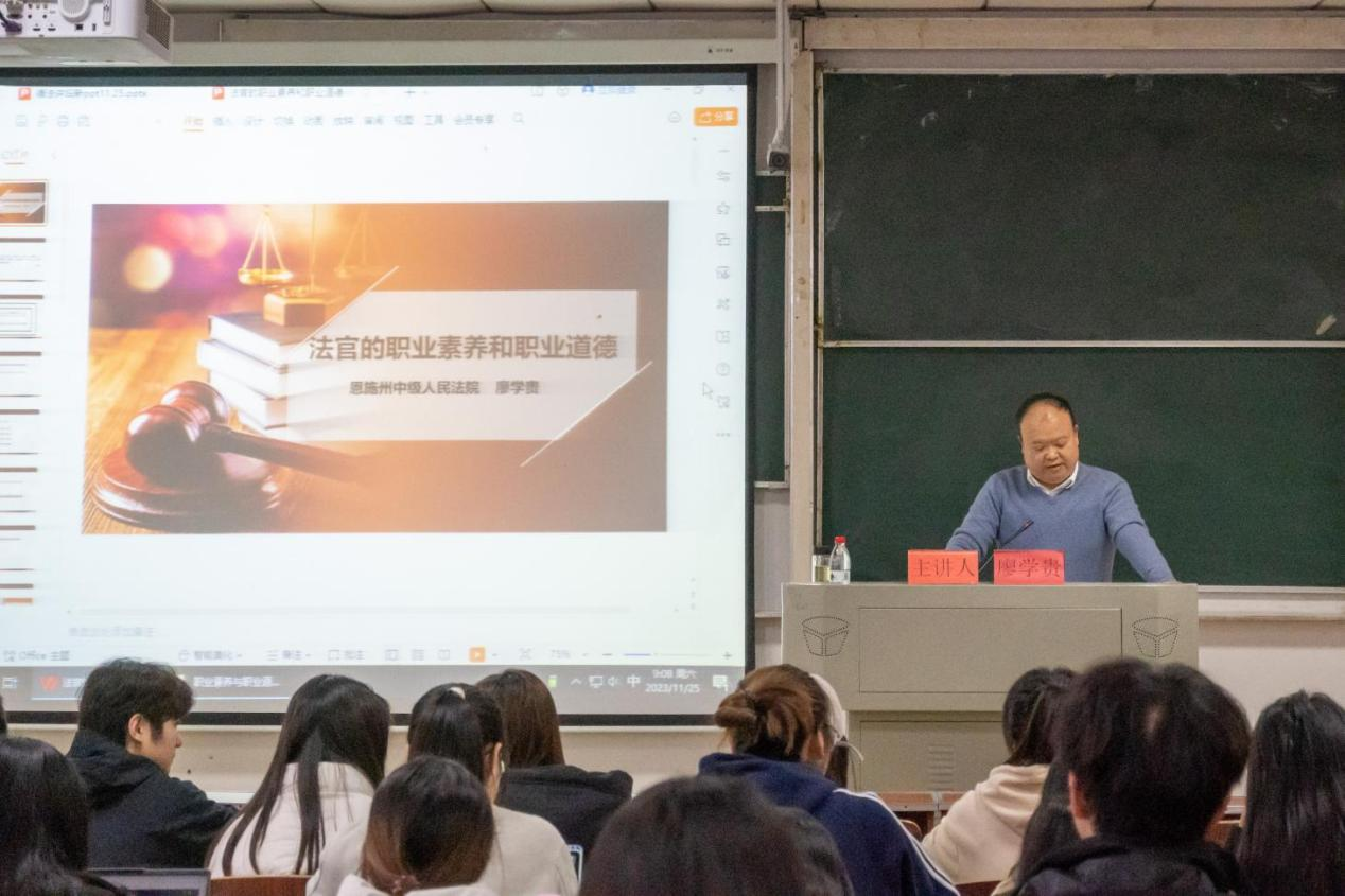 本网讯(记者张魏 徐雄泽 朱宇/文 见习记者 谢雨颖/图)11月25日, “法官的职业素养和职业道德”专题讲座在我院9A410教室举行,恩施州中级人民法院党组成员、副院长廖学贵主讲,法学院副院长李文革主持,2023级法律硕士研究生及部分本科生参加。