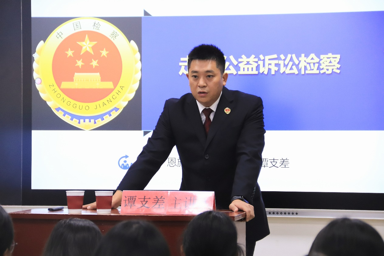 讲座伊始,谭支差从公益诉讼检察的发展历程、核心要点以及恩施州如何切实落实公益诉讼检察制度三个层面引入主题。随后,谭支差表示保护公共利益是公益诉讼检察的主要理念,诉前实现维护公益目的是最佳的司法状态,应力求以最小司法成本实现公益保护。同时,作为新兴法律制度,公益诉讼检察制度还有广阔的发展空间值得去探索。最后,他鼓励学生珍惜时间勤奋学习,牢记校训、知行合一,为成为一名优秀的法律工作者而不断奋斗。