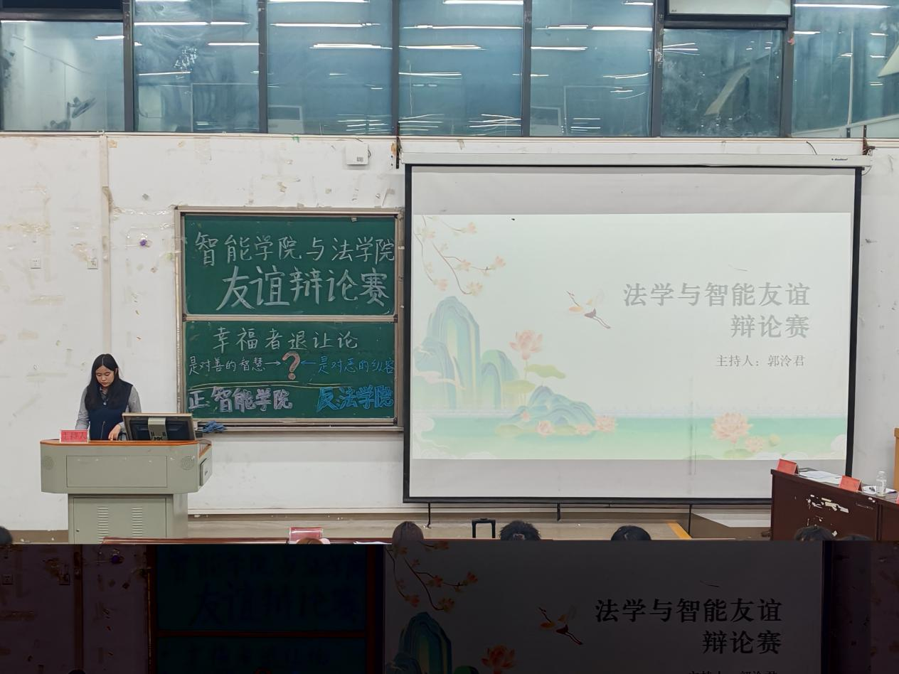 本网讯(记者 袁本怡 见习记者 曾钰格/文 见习记者 李佳萱/图)4月26日,我院联合智能与工程学院于5B508教室举办了以“法护新程,智启未来”为主题的友谊辩论赛,共160余名本科生参加。