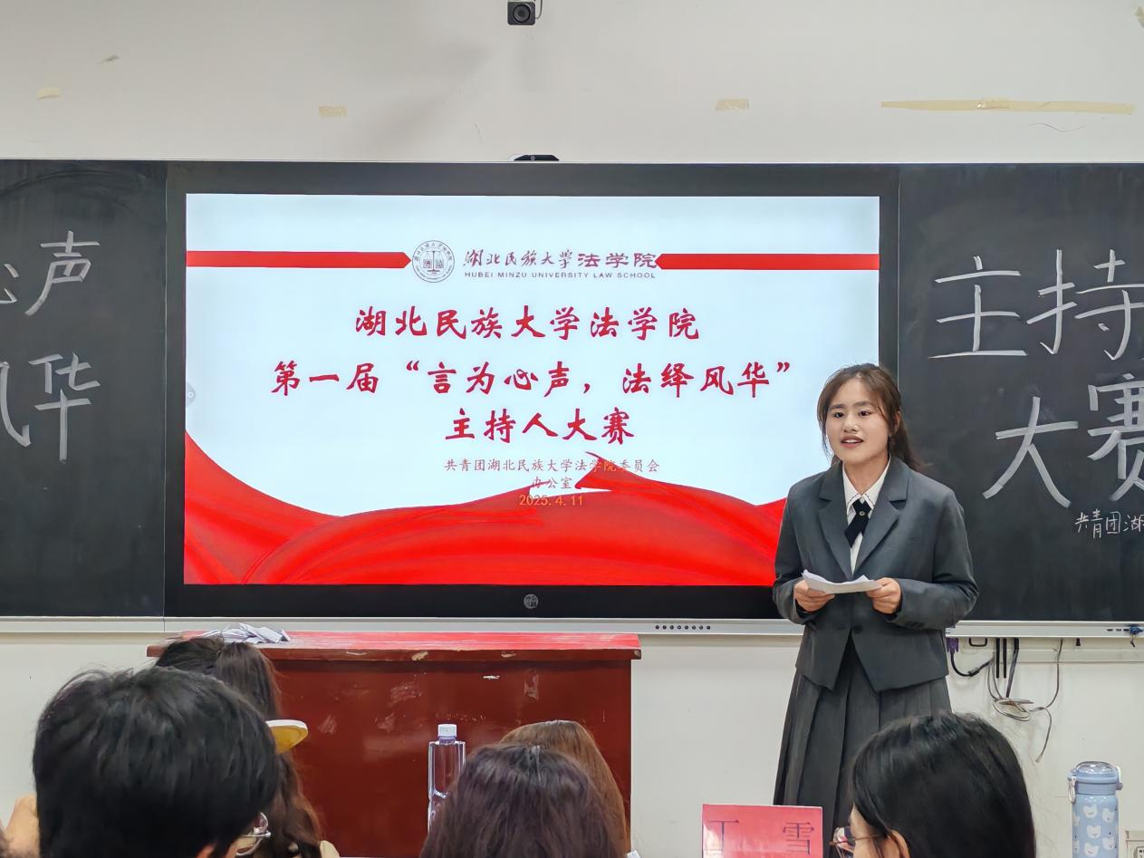 本网讯(记者 袁本怡 见习记者 曾钰格/文 实习记者 李佳萱/图)4月11日,以“言为心声,法绎风华”为主题的主持人大赛于我院9B306教室举行。法学院团委副书记丁雪同学、365电子娱乐官方网站讲解团团长崔钰婕同学、365电子娱乐官方网站广播台负责人田曼琦同学担任评委,我院多名本科生参赛。