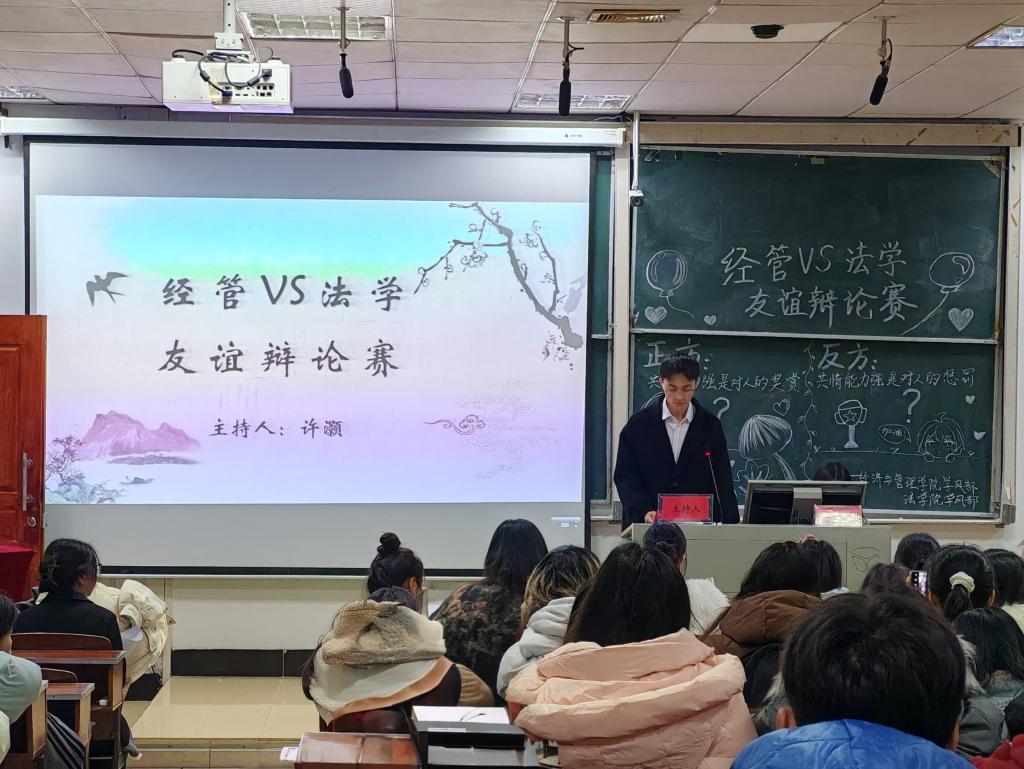 本网讯(记者 袁本怡 见习记者 刘微微/文 李佳萱/图)2月28日,我院同经济与管理学院于9A411教室联合举办了以“以辩会友,论之有道”为主题的友谊辩论赛,两院共200余名本科生参加。