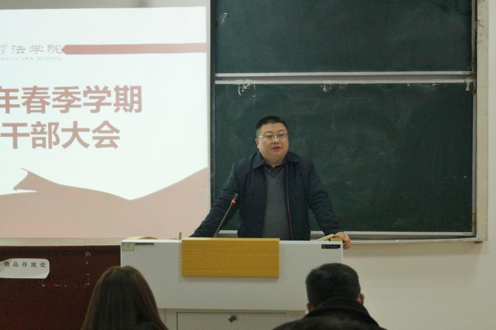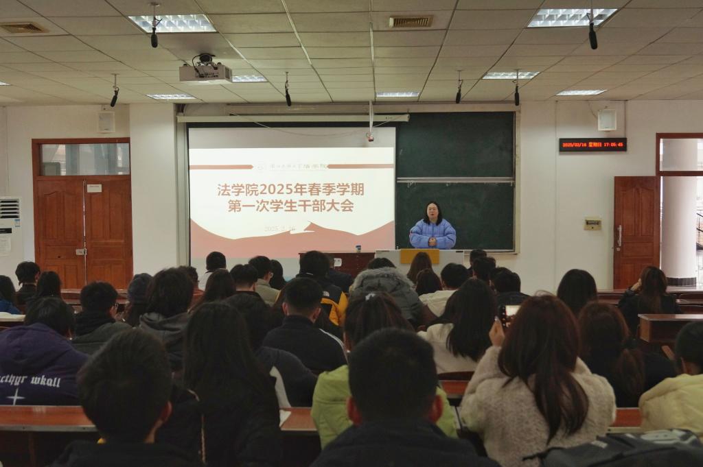 本网讯( 谢学婧/文 黄煜基/图 )2025年2月16日,我院于德智楼9B301教室召开2024年秋季学期第一次学生组织大会。法学院团委、学生会、公寓管理委员会、通讯社的100余名学生干部参与会议,法学院党总支副书记黄晓波、学生科科长阙嘉苗、学生党支部书记彭阳出席会议,团委书记谢学婧主持会议。