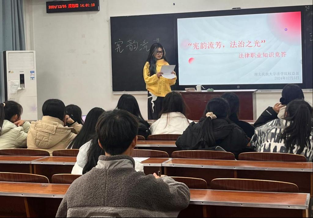本网讯(记者 夏依果/文 谭血玲/图)12月5日,我院于德智楼9B305教室举行“宪韵流芳,法律之光”宪法知识竞答活动。本次活动由我院权益部副部长聂静怡任主持人,30余名本科生到场参赛。