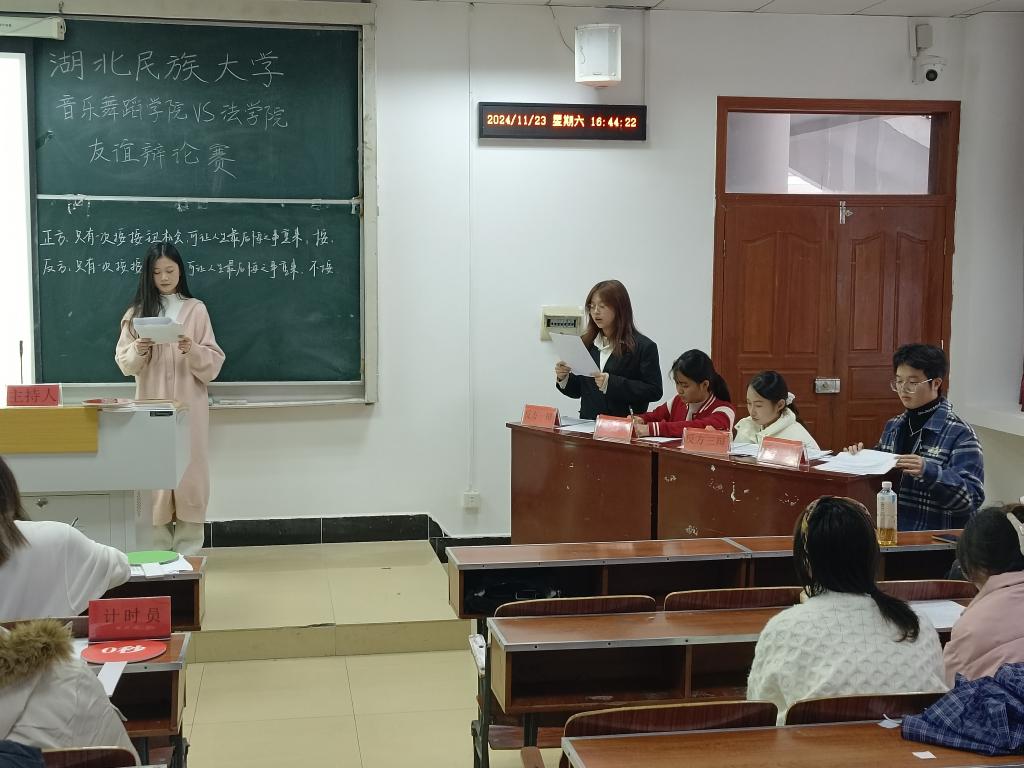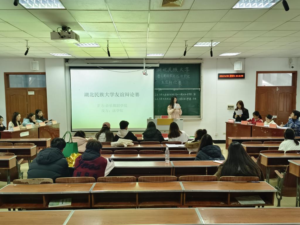 本网讯(记者 袁本怡/文 谭正法/图 )11月23日,我院与音乐舞蹈学院于德智楼9B301共同举办友谊辩论赛。