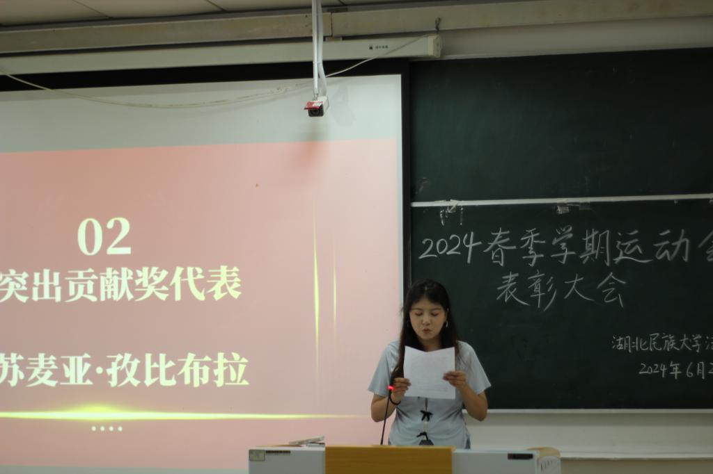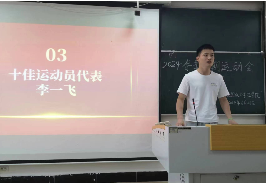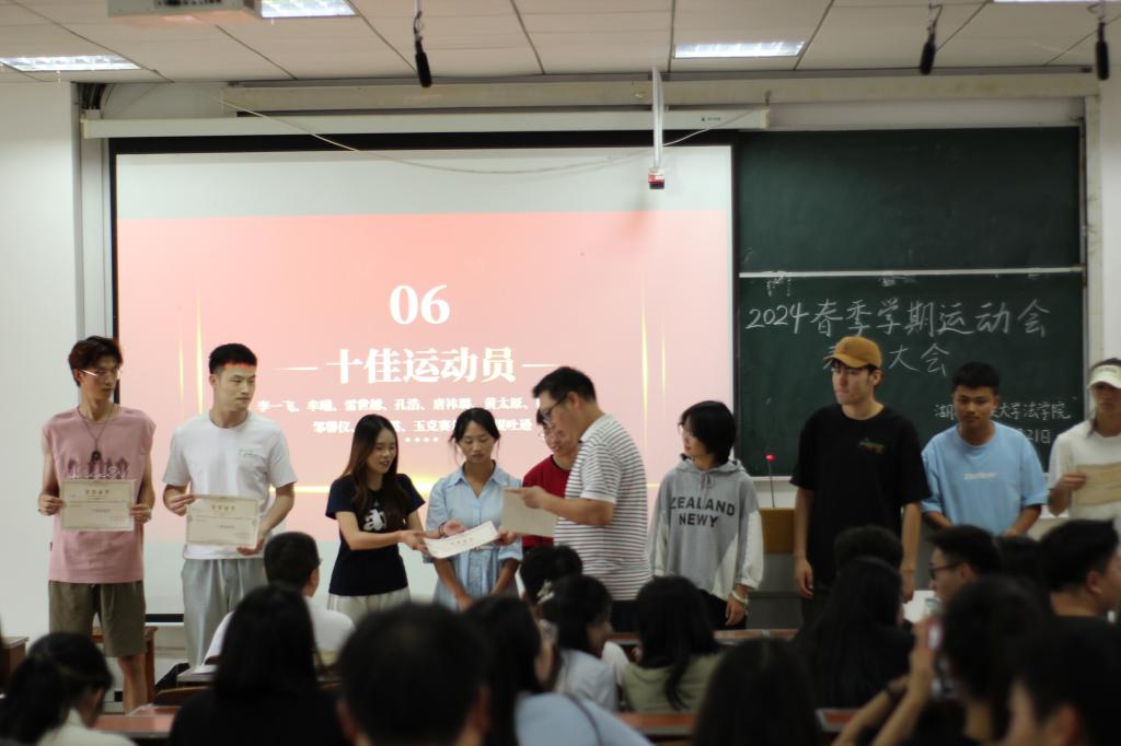 大会伊始,老师与学生一同观看法学院运动会剪辑短片,回顾精彩瞬间。接着,阙嘉苗老师宣读运动会表彰人员名单并邀请运动员与工作人员代表发言。牟曦、苏麦亚·孜比布拉、李一飞分别作为团体项目代表、突出贡献奖代表、十佳运动员代表,表达了对全体运动员和工作人员的感谢和对法学院的热爱。随后,老师们为获奖学生颁发荣誉证书。最后,张明波书记进行总结发言,对获奖学生表示祝贺,希望今后同学们可以保持佳绩,再创辉煌。