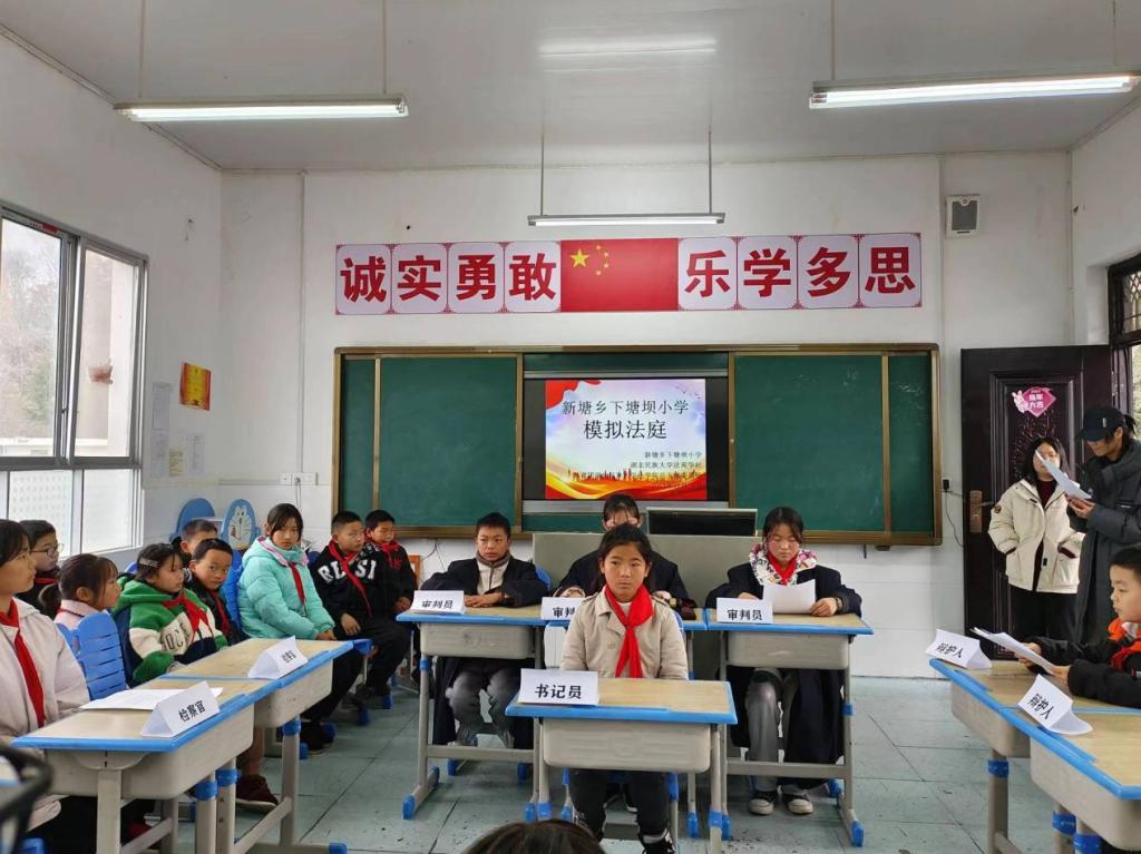 本次活动环节分为模拟法庭和防性侵普法宣传讲座两部分。其中,模拟法庭环节以一起校园欺凌引发的正当防卫案为剧本,下塘坝小学同学们踊跃参加,纷纷化身“审判长”“辩护人”“公诉人”等角色。“全体起立,请审判长、审判员入庭”,伴随着书记员宣布,一场别开生面的“庭审”拉开序幕。“庭审”中,小学生们按照各自角色定位,依照法定程序,有条不紊地开展了法庭调查、法庭辩论、被告人最后陈述、当庭宣判等环节,完整展现了法庭审理的场景和全过程,学生们“沉浸式”体验了庭审现场。