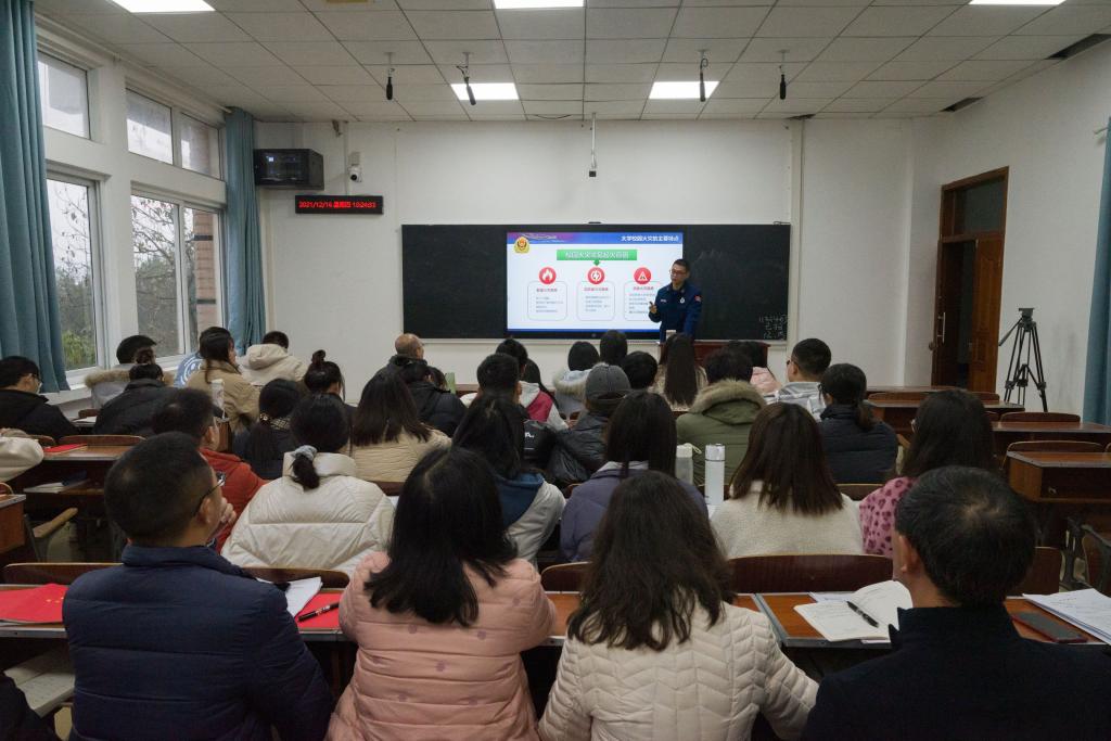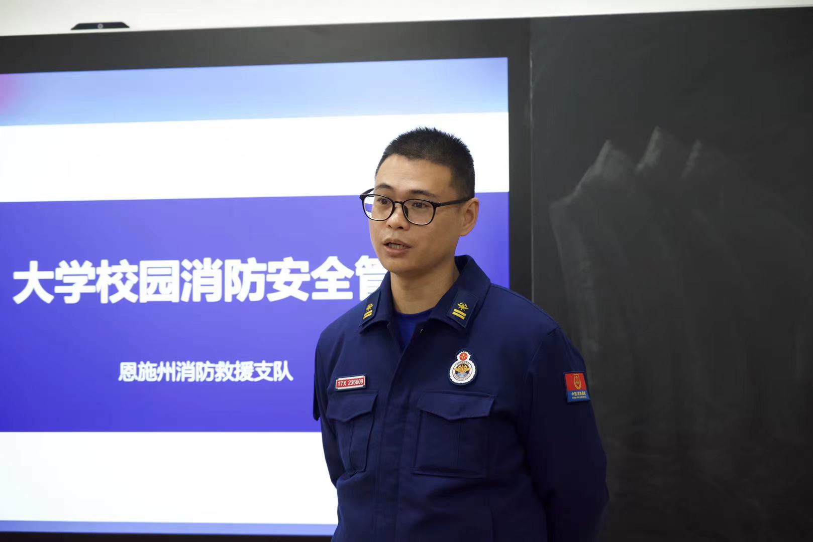 12月16日,我院党总支组织开展了一次别开生面的主题党日活动。我院全体党员在主题党日活动的特色实践中系统学习了校园消防安全知识、学习使用灭火器和消防水带、进入学生寝室排查消防安全隐患等知识,用实际行动织密校园消防安全防线,贯彻党中央“人民至上、生命至上”的总要求。恩施州消防救援支队宣传员许国虎同志受邀在德智楼9B305教室进行了消防安全知识讲座和消防器材使用演示。