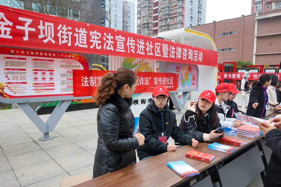 当日清晨,我院学生在我院模拟法庭进行“弘扬宪法精神,厚植爱国主义情怀”主题宪法晨读,朗读《中华人民共和国宪法》部分内容。上午,我院学生党支部、研究生党支部与金子坝街道联合举办了“宪法宣传周”活动。李文革为街道全体党员干部、各社区工作人员进行《中华人民共和国宪法》知识专题授课。社区工作人员在办事处门口“开摊设点”进行宪法宣传进社区暨法律咨询服务,为来来往往的群众发放《中华人民共和国宪法》《中华人民共和国民法典》宣传手册,我院老师及学生为来访咨询的居民进行“一对一”的免费法律咨询服务。