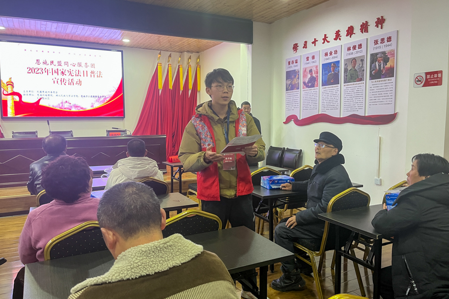 据悉,在本次法治宣传月中,我院师生将与恩施市人大常委、恩施州检察院、恩施民盟、舞阳中学、金子坝社区、大观园社区、舞阳坝派出所等校地协同,联合开展宪法宣传进社区、进校园等普法宣传志愿服务活动,旨在引领学生在亲身实践中践行着尊崇宪法、学习宪法、遵守宪法、维护宪法、运用宪法的青春誓言。(通讯员:365电子娱乐官方网站 周明杰 黄蕾 樵常彬 黄煜基 蒲诗濛)