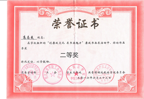在党委宣传部、校工会、学生工作处及校团委共同举办的“创廉政文化展书画魅力”书画展中,周震老师荣获一等奖,高志爽老师荣获二等奖,向会立和李让奎老师获三等奖。
