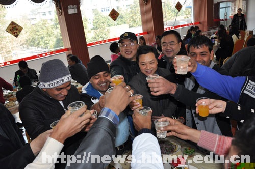 上午11点左右,留学生们陆续入场,国际教育学院学生管理科工作人员为同学们安排好酒席位置,来自尼泊尔,印度,加纳的留学生和学校领导,老师们围桌而坐,一起共庆中国传统佳节中的“小年”。宴会于12点准时开始,校领导携相关部门领导、老师依次给同学们敬酒,并向各位同学送上新春祝福,祝愿留学生在中国过一个平安、祥合和愉快的寒假。