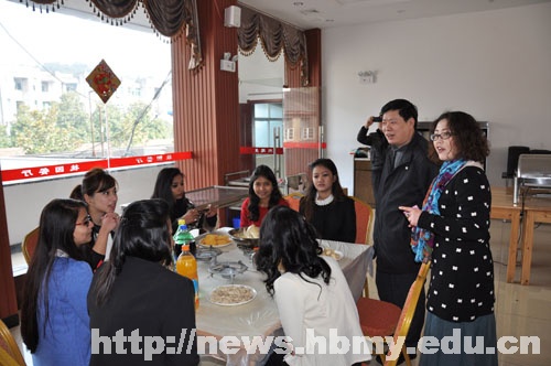 本网讯(通讯员张建华)2015年2月12日农历腊月24中午12点,我校在教工食堂二楼举办留学生2015年春节茶话会和团年活动。在校留学生和教师欢聚一堂共贺中国羊年新春。副校长汪兴平,国际教育学院院长覃敏,国际交流合作处副处长罗永健,医学院副院长郭有锋,附属民大医院副院长张银高和国际教育学院全体教师和部分在校任课教师一同参加了团年活动。