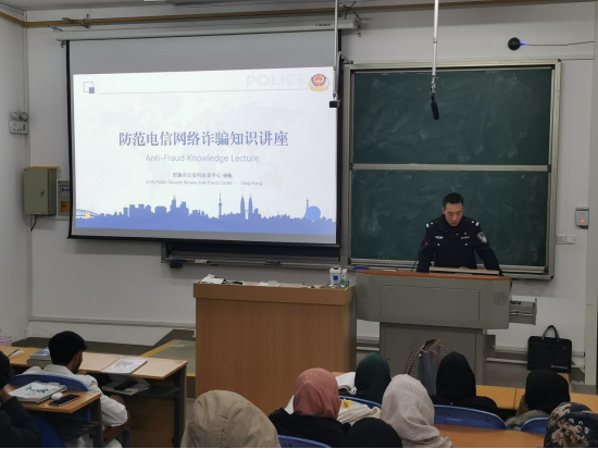随后,反诈中心的工作人员针对电信网络诈骗这一热点问题展开讲解。随着互联网的普及,国际学生群体也面临着诸多诈骗陷阱。工作人员通过介绍常见的诈骗手段,如虚假投资、冒充公检法等,并结合实际案例,向学生们传授了识别诈骗的方法和防范技巧,提醒大家在日常生活中要提高警惕,保护好个人财产安全。讲座最后,反诈中心民警同志还列举了一些常见的诈骗套路供同学们识别,现场同学踊跃发言,并在作答结束后领取了小礼品。