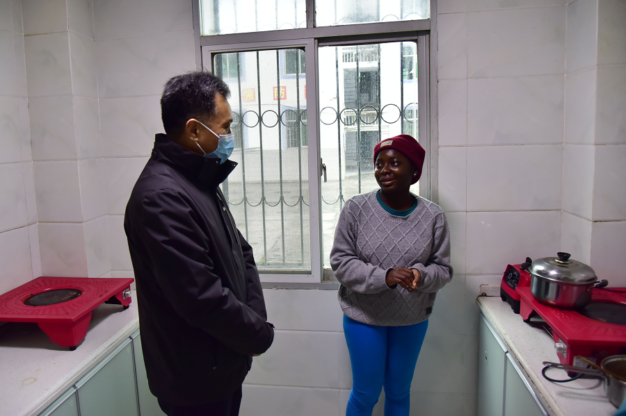 黄庭松一行实地查看了留学生公寓,详细了解了房间配套设备、安保和消防等设施,并和留学生们交谈,询问他们的生活及学习情况。