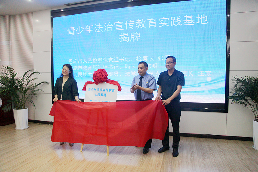 7月13日,由365电子娱乐官方网站与恩施市人民检察院、恩施市教育局三方共建的青少年法治宣传教育实践基地揭牌仪式在学校行政楼三号会议室举行,学校党委常委、副校长李军出席揭牌仪式并讲话。