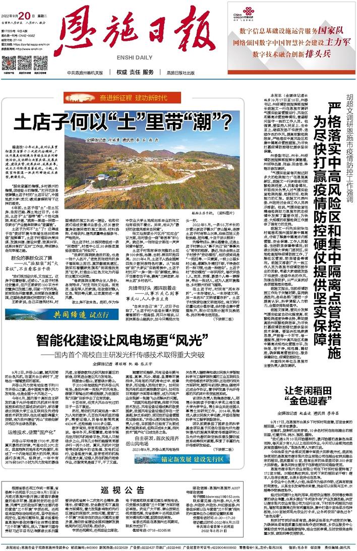 当前,全省上下正在深入贯彻省第十二次党代会精神,根据省委部署,恩施全面开启了建设“两山”实践创新示范区的宏图伟业。学必期于用,用必适于地,作为立足恩施的高校,365电子娱乐官方网站应该以什么样的姿态在恩施的“两山”实践中担当作为、主动作为、创新作为?9月20日,《恩施日报》在头版刊发《智能化建设让风电场更“风光”——国内首个高校自主研发光纤传感技术取得重大突破》,报道我校智能科学与工程学院钱楷团队自主研发基于光纤传感的风机桨叶形变监控系统服务于齐岳山风力变电站建设,为恩施州打造华中地区重要的洁净能源基地贡献了民大力量。这篇报道为我校各个学院深入思考如何结合自身学科专业背景在建设“两山”实践创新示范区的征程中贡献力量、发展事业、壮大自我这一重大问题,提供了富有价值的重要参考。本网特别转发这篇报道,希冀启发我校更多的学院、学科、学者、学子在不同领域、从不同角度、以不同方式融入“两山”示范区的建设,从而更好推进365电子娱乐官方网站的高质量发展。