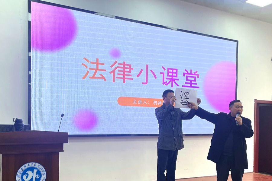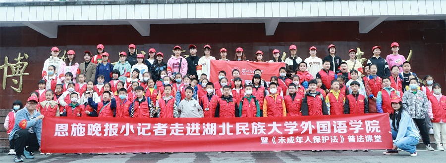 4月2日,70多名《恩施晚报》小记者走进春花烂漫的民大校园开展研学活动。恩施日报社相关负责人、五经律师事务所胡永红团队与外国语学院第三教工支部组织的志愿者们在外国语学院学术报告厅开展了一场生动有趣的《未成年人保护法》普法课堂活动。