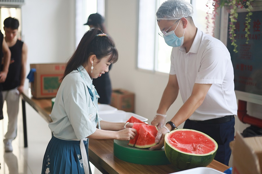为迎接新生及家长的到来,学校食堂采取一系列措施为新生提供贴心服务。东苑食堂为新生及家长提供免费的西瓜、绿豆沙等,在确保食品安全与优质服务的同时,尽量满足来自全国各地的新生与家长的口味,获得一致好评。