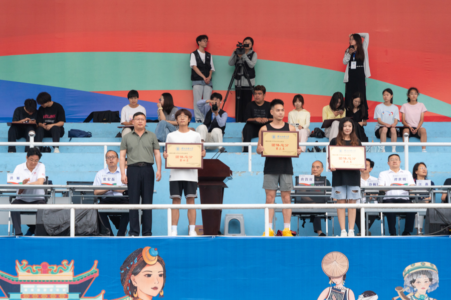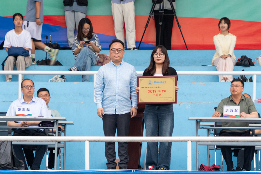学校党委委员、党委宣传部常务副部长罗翔宇宣布本届运动会宣传工作奖获奖名单。文学与传媒学院荣获宣传工作一等奖,经济与管理学院、马克思主义学院、化学与环境工程学院获得二等奖,法学院、外国语学院、数学与统计学院、生物与食品工程学院、体育学院获得三等奖。