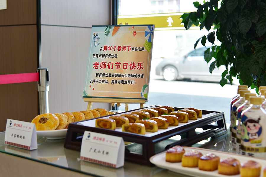 9月10日中午,后勤保障部联合恩施州利贞餐饮管理有限公司组织了“感念师恩 以‘食’为礼”创意活动。工作人员吉他弹唱《走过老师的窗前》,气氛串联《节日快乐歌》,并随机为100位老师赠送了手工甜品。现场气氛热烈,老师们积极参与有奖竞答及才艺表演活动。
