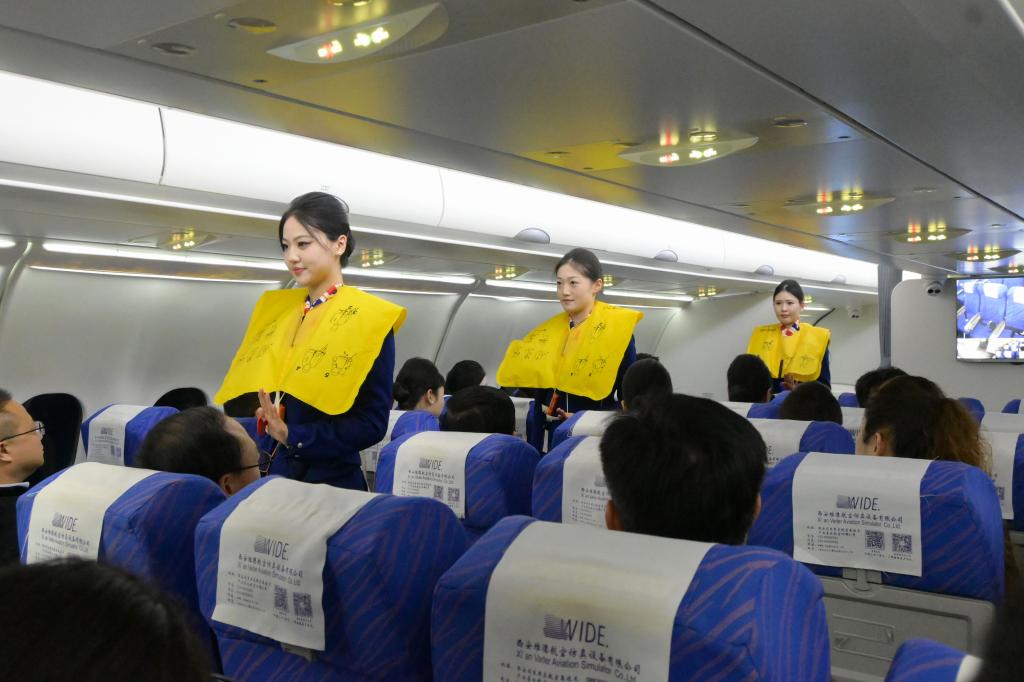 向前进一行深入教学一线调研观摩,在航空服务艺术与管理实训中心教学模拟舱沉浸式体验了起飞前安全演示、模拟巡航、紧急迫降等实操环节,听取了老师们的教学点评及交流探讨。