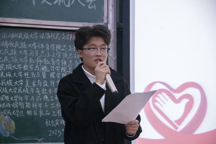 2022级志愿者代表张前伟发言。他以习近平总书记对新时代青年的寄语,号召青年学子坚定理想信念,做有理想、敢担当、能吃苦、肯奋斗的新时代好青年。他希望新一届志愿者能持之以恒、努力付出,秉承青年志愿者精神、无私奉献精神,用实际行动践行社会主义核心价值观,诠释志愿者真谛。