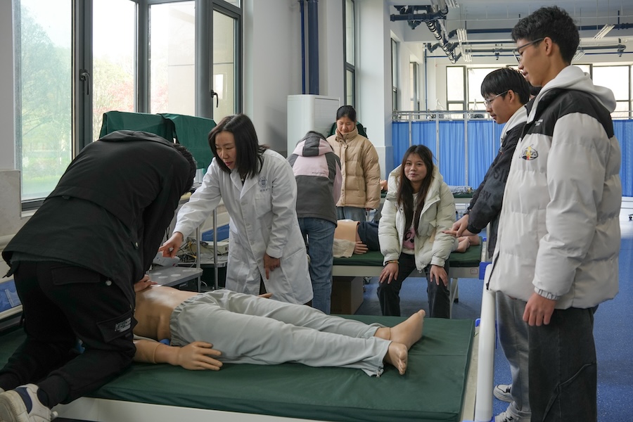在医学部实训中心,医学部护理系张翠兰老师为学生进行了急救技能培训。张翠兰通过理论讲解和现场演示带领学生学习心肺复苏术,向学生传授心肺复苏急救技能,增强学生的生命安全和自我保护意识。学生还在老师的指导下通过分组的形式亲身体验了心肺复苏操作。