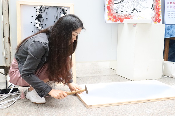 本网讯(通讯员 张健/文 记者 卢玥/图)5月21日上午,美术与设计学院在该院一楼展厅举行2021届设计系毕业作品展——“感物”,该院设计系老师受邀观看展览并对作品进行指导。