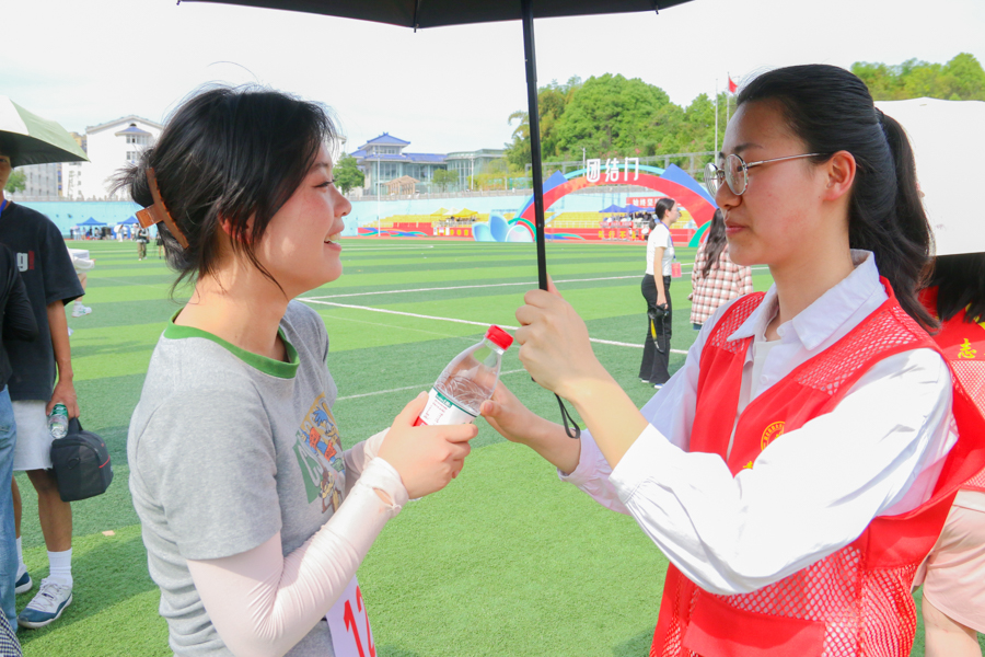 赛场内外,有一群洋溢着活力的志愿者。他们驻守在操场的各个角落,奔走在运动场之间,为运动员保驾护航,陪跑、递水、赛后搀扶,志愿者与运动员的双向付出,让人倍感温馨,他们都是这运动场上最美的荣光。