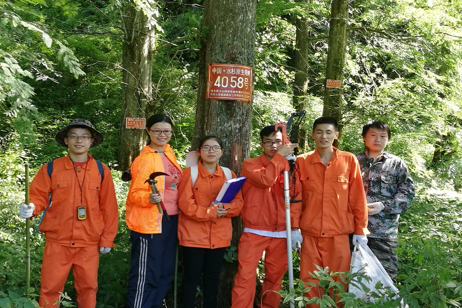 姚兰(左二)与团队老师一起带领本科生调查水杉母树