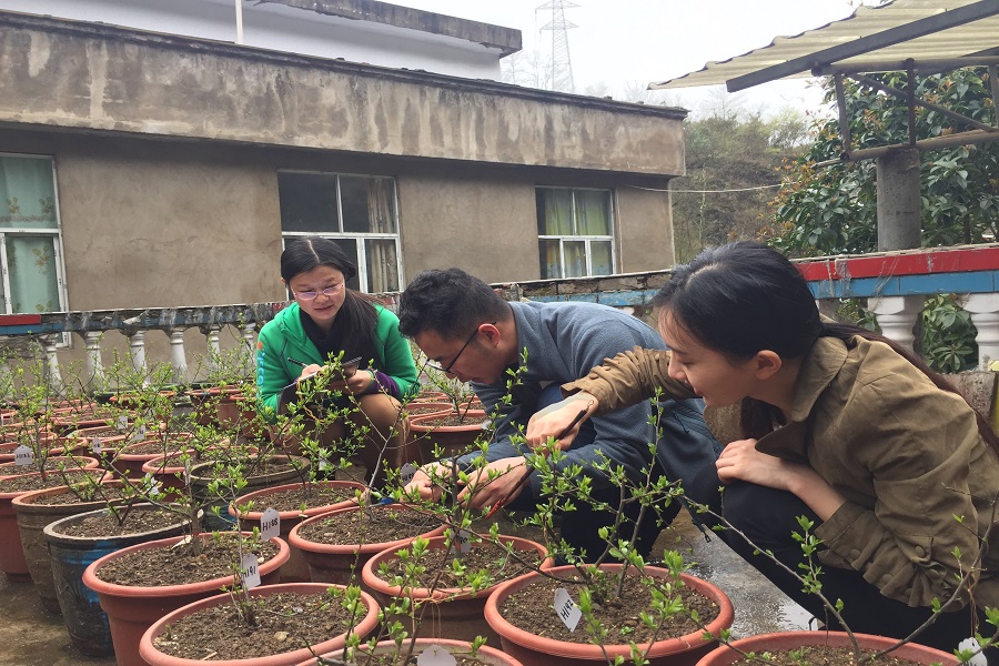 姚兰(左一)带领研究生观测极小种群物种-黄梅秤锤树生长状况