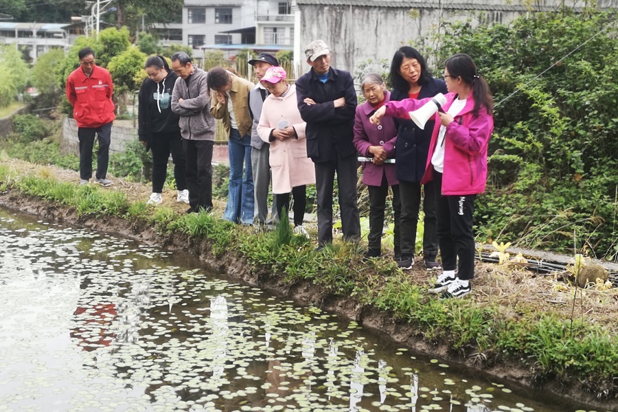 “减少莼菜田里的螺蛳,可撒施茶籽饼,可在莼菜田中放养鱼。”4月27日上午,马前村二十一组石耀武的莼菜田周围人头攒动,王明红博士正在讲解莼菜虫害防治关键点。