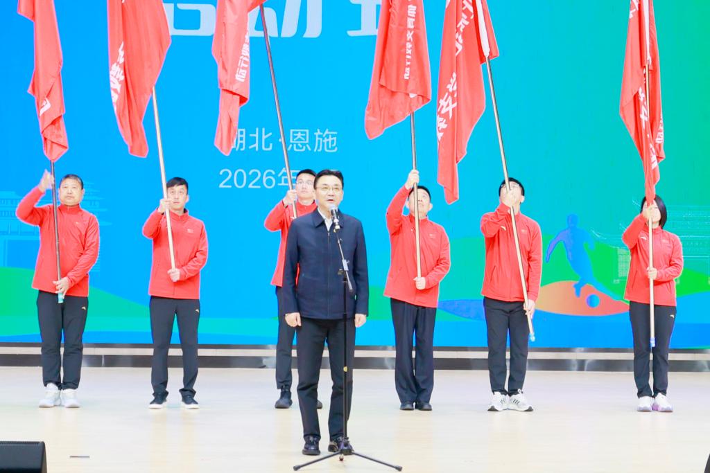 3月31日,2026年体育支教志愿服务工作调研暨湖北省“千师百校”体育支教行动启动式在365电子娱乐官方网站举行。湖北省体育局党组书记、局长水兵宣布湖北省体育支教行动正式启动。国家体育总局青少司司长李辉,湖北省体育局党组成员、副局长骆启义共同为11支高校体育支教团授旗,标志着2026年体育支教工作全面铺开。