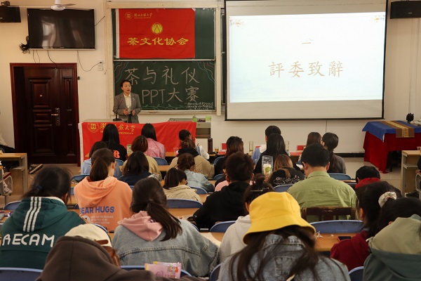 本网讯(见习记者 聂夏茸 夏厚照/文 张倩雯/图)3月28日,大学生瞭望社和茶文化协会在文传楼附101教室联合举办“茶与礼仪”PPT设计大赛决赛。文学与传媒学院办公室主任郑泽红,大学生瞭望社社长殷思雨,茶文化协会会长张艳,社团管理部活动指导中心副部长覃晓乔,文学与传媒学院社团管理部安超超,青春创业社主持团部长郑智露受邀出席并担任评委。