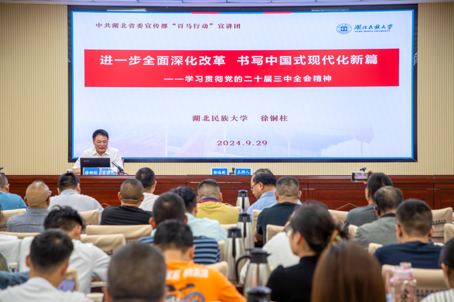 宣讲团由学校党委委员、党委宣传部常务副部长罗翔宇教授,学校党委委员、马克思主义学院院长徐铜柱教授,马克思主义学院党总支书记向驰博士,周传和副教授、熊治东副教授、鲁帅博士组成。宣讲团成员分赴鹤峰各县直部门和9个乡镇为机关党员干部、村(社区)两委等开展了全县全覆盖的理论宣讲。